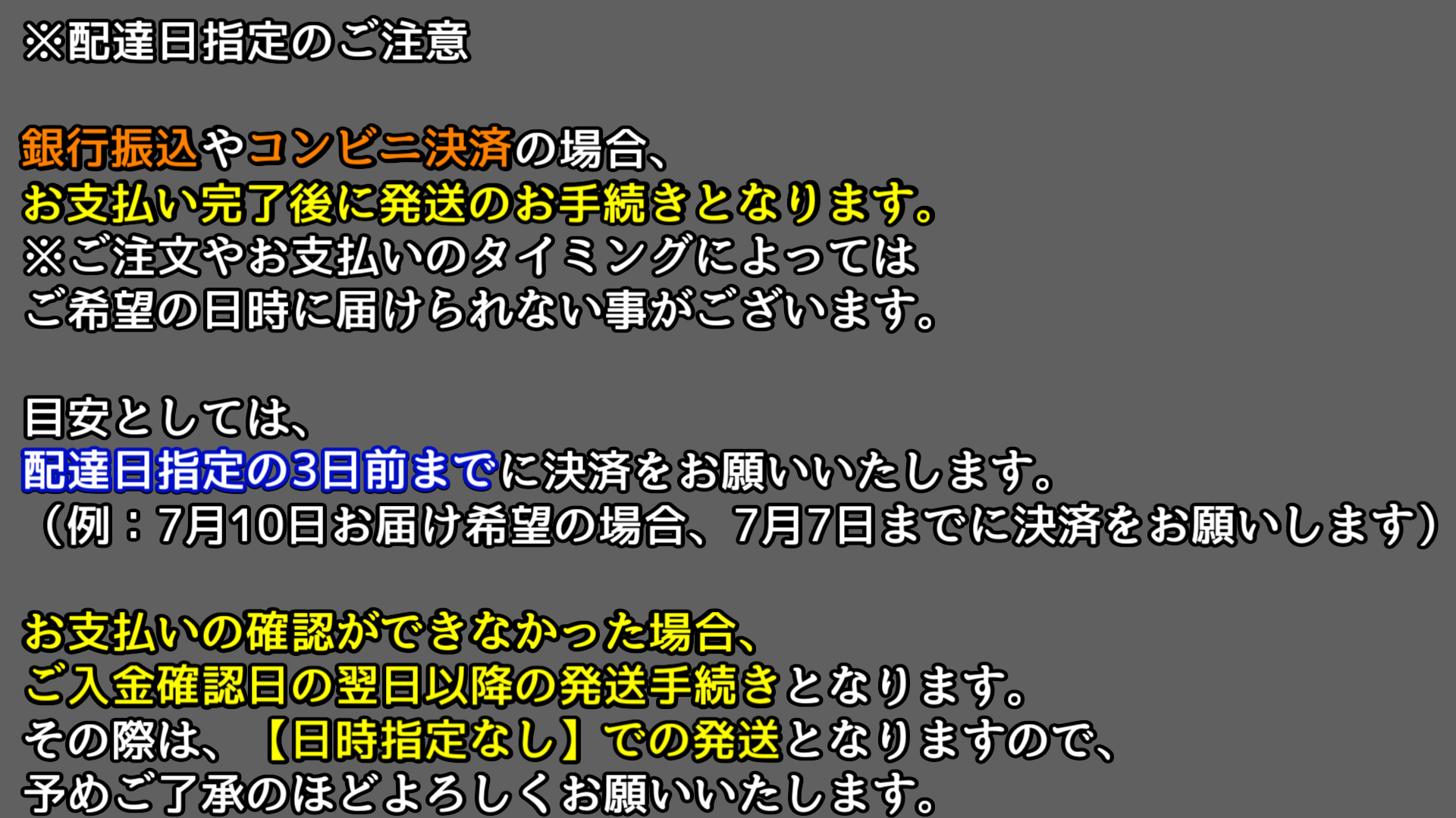 ※配達日指定につきましては、運送業者(ヤマト運輸)への依頼となりますので、確約はできかねますことご了承ください。